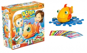 RYBEK Nie Na Żarty - to wspaniała zręcznościowa gra dla dzieci w wieku powyżej 4 lat.Największą atrakcją gry jest elektroniczna rybka.Po przesunięciu guziczka w pozycję ON znajdującego się na spodzie, rybka zacznie się obracać.Gra jest bardzo prosta.Podziel 12 kart na ilość graczy, tak by wszyscy mieli taką samą ilość kart do gry.Włącz rybkę i ustaw ją na podstawce.Gra rozpocznie się, gdy Rybek odwróci się do jednego z graczy i zapyta o kartę "masz jedzonko?" "uwielbiam jeść" ...Gracz, do którego się obróci Rybek musi wsunąć kartę w jego pyszczek.Pospiesz się. W przeciwnym razie Rybek Cie pominie.Jeśli nie zdążysz Rybek odwróci się do innego gracza.Kiedy Rybek otrzyma kartę od innego gracza wypowie jedną z kilku fraz np. "bombastycznie", "uwielbiam to", następnie obróci się w kierunku innego gracza i wyrzuci kartę w jego stronę.Gracz ten musi dołączyć kartę do swoich pozostałych kart.Koniec gry następuje, gdy jeden z graczy pozbędzie się wszystkich kart.Wówczas Rybek odwróci się w jego stronę i poinformuje Go "Wygrywasz!"ZAWARTOŚĆ:- Rybek,- podstawa,- 12 kart.WIEK:4 lata +WYMIARY:opakowania 25,5 x 25,5 x 10,5Rybka długość ok 20 cmśrednica podstawy 22 cmWAGA:430 gZASILANIE:3 x bateria AAA (LR03) - brak w zestawieUWAGI:Nieodpowiednie dla dzieci w wieku poniżej 3 lat, ze względu na drobne elementy łatwe do połknięcia-ryzyko udławienia.