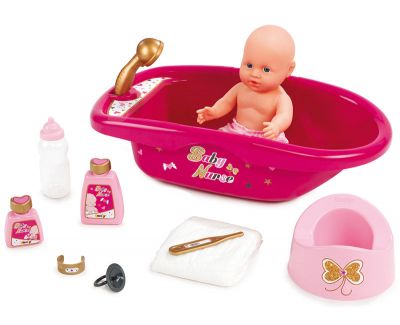 Zestaw utrzymany jest w ślicznej kolorystyce, dzięki której przykuję uwagę dzieci na wiele godzin wspaniałej zabawy. Wanienka sprawi dziecku ogromną radość. Każda dziewczynka uwielbia chlapać się w wodzie - już od dziś będzie mogła świetnie się bawić przy prawdziwej kąpieli swojego bobasa. Zabawka jest bardzo dobrej jakości, a jej wzornictwo i tematyka przyczyniają się do rozwoju dziecka. Zestaw zawiera: pieluszkę, smoczek, termometr, opaskę na rączkę, słuchawkę prysznicową oraz 2 pojemniczki - imitacja kosmetyków a także nocniczek razem aż 9 elementówZestaw nie zawiera lalki.