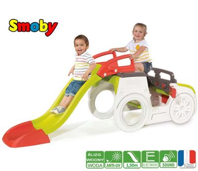 Nowa ekscytująca przygoda dla małych odkrywców. Samochod Przygód od firmy Smoby oferuje liczne sposoby zabawy dla wiekszej grupy dzieci. Zupełnie jak w prawdziwym aucie dzieci mogą zasiąść za kierownicą. Posiada ona elektroniczny moduł oraz stacyjkę na kluczyk.Wejście odbywa się zarówno od strony kierowcy jak i pasażera. Na zjeżdżalnię wejście odbywa się poprzez antypoślizgowe schodki umieszczone za siedzeniem kierowcy i pasażera. Ślizg zjeżdżalni wynosi 150 cm. W gorące letne dni istnieje możliwość podłączenia do ślizgu zjeżdżalni węża ogrodowego.Duże zaskoczenie czeka małych odkrywców gdy podniosą maskę samochodu: znajduje się tu piaskownica , którą można także wykorzystać jako skrzynię na zabawki.Produkt wykonany został z wysokiej jakosci tworzywa odpornego na promienie UV.