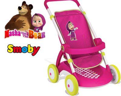 Wózek - spacerówka dla lalek posiada różowe siedzisko uszyte z materiału w białe kropki ozdobione motywem Maszy. Plastikowo-metalowy stelaż utrzymany jest w biało-różowo-zielonych barwach. Spacerówka ma 4 kółka, praktyczną, plastikową półkę na zakupy oraz obręcz, zabezpieczającą lalkę przed wypadnięciem. Przeznaczona dla lalek 42 cm.