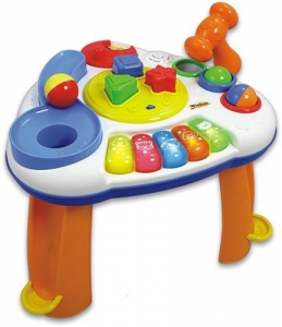 Śliczny interaktywny muzyczny stoliczek z piłeczkami SMILY PLAY posiada dużą ilość atrakcji dla maluszka. Stolik ćwiczy sprawność manualną rąk. Uczy koncentracji. Zachęca do aktywnej zabawy. Uczy dzieci zręczności oraz logicznego myślenia. Każde wbicie piłeczki do otworów w stoliczku, lub odpowiednie dopasowanie klocków do otworów z rysunkami instrumentów, zostaje nagrodzone: stół wydaje zabawne dźwięki, gra melodyjki i miga świecącymi klawiszami. Stoliczkiem może się dzidziuś również bawić, bez zamontowywania nóżek. Ma śliczne żywe kolory. Wykonany jest z wysokiej jakości plastiku. Posiada odpowiednie atesty. Zabawka działa w 2 trybach: 1. W trybie GWIAZDKI Dzidziuś grając na pianinku usłyszy: ptaszka, kotka, pieska, kaczkę i żabkę. Kiedy nasz maluszek dopasuje klocek do otworów z sortera, zagrają dla niego: marakasy, bębenek, lub cymbałki. 2. W trybie NUTKI, Każdy klawisz zagra kilka rosnących dźwięków, brzmiących jak z pianina. Kiedy nasz maluszek dopasuje klocek do otworów z sortera, zagrają dla niego wesołe melodyjki. Wrzucone piłeczki do otworów stoliczka, zlatują na dół i zatrzymują się w nóżkach zabawki. Twoje dziecko będzie zachwycone z tylu nowych możliwości. ZAWARTOŚĆ: Stoliczek posiada: -grzechoczące piłeczki, -trzy klocuszki o kształtach: kwadratu, trójkąta i gwiazdki, -plastikowy młoteczek do wbijania piłeczek, -kolorowe pianinko z wizerunkami zwierzątek, -rynnę do toczenia piłeczek, -otworki do wrzucania piłeczek - terkocący księżyc, z uchwytem do kręcenia, pod którym znajduje sie kolejny otwór do wrzucania piłeczek WIEK: 12m+ WYMIARY: wymiary opakowania: 55 x 40 x 10 cm wymiary zabawki: 38 x 38 x 38 cm (kształt trójkąta) wysokość stoliczka: ok.33 cm. ZASILANIE: 3 paluszki AA - załączone baterie testoweUWAGI:produkt nie jest przeznaczony dla dzieci poniżej 3 roku życia