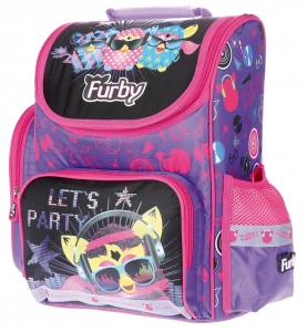 Na klapie głównej komory tornistra znajduje się nadruk 3 Furby, na kieszeni przedniej znajduje się Furby z napisem "Let's party!".Klapa zapinana jest na suwak.