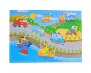 Puzzle drewniane pojazdy to idealna gra dla Twojego dziecka!!Puzzle z obrazkami pojazdów to nie tylko sposób na nudę i zabicie czasu, to także rozrywka i nauka. Za pomocą układania puzzli Twoje dziecko rozwinie umiejętności manualne, pamięć wzrokową, koordynację ruchowo-wzrokową oraz kreatywność i wyobraźnię.Piękne wykonanie, kolory oraz pojazdy (m.in. helikopter, traktor, pociąg, straż pożarna) przedstawione na obrazkach przyciągną uwagę Twojego dziecka i zachęcą je do zabawy!Zestaw zawiera 24 elementy drewnianych, starannie wykonanych puzzli. Wielkość pojedynczego elementu to ok. 5 x 5,5 cm - pozwala to na zabawę nawet młodszym dzieciom. Puzzle posiadają drewnianą ramkę, która nie tylko ułatwia układanie elementów, ale również ich przechowywanie.Zabawka posiada certyfikat jakości i bezpieczeństwa CE. ZAWARTOŚĆ:- śliczne puzzle drewniane 24 elementy WIEK:powyżej 3 lat WYMIARY:ułożone: 30 x 23 x 0,5 cm1 element: 5 x 5,5 x 0,5 cmZASILANIE:nie dotyczy UWAGI:Nieodpowiednie dla dzieci w wieku poniżej 3 lat. Zawiera małe elementy, które mogą zostać połknięte. Opakowanie nie jest zabawką. Przed podaniem zabawki dziecku usunąć wszystkie elementy opakowania. Opakowanie należy zachować.