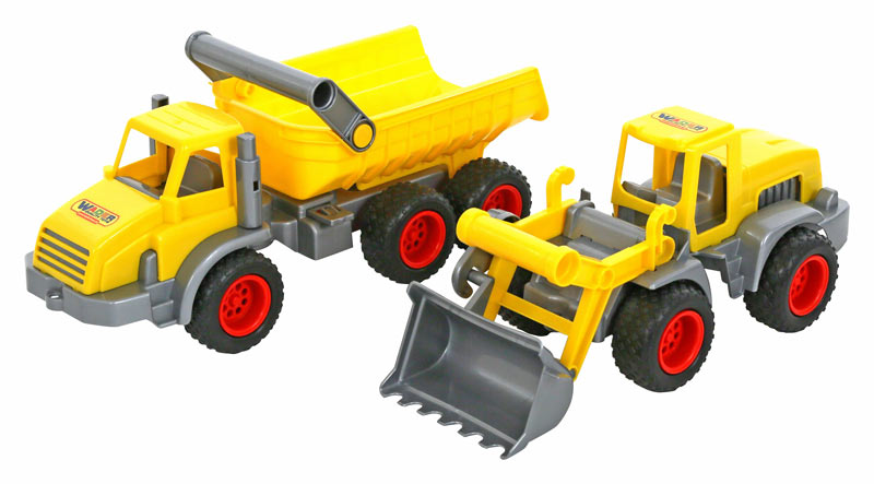Wspaniały zestaw Wywrotka + Traktor renomowanej polskiej firmy Wader wywoła uśmiech na twarzy każdego malucha. Idealny prezent na każdą okazję.W skład zestawu wchodzą: trójosiowa ciężarówka z wywrotką,skrętną kabiną traktor z ładowarką,skrętną kabinąOba pojazdy posiadają gumowe koła i wygodny uchwyt.Charakteryzuje się bardzo dobrą konstrukcją i dużą wytrzymałością. Produkt wykonany z najwyższej jakości tworzyw sztucznych.