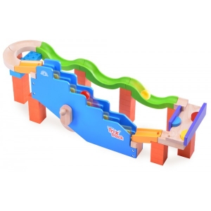 Zestawy Wonder Trix Track to coś więcej niż drewniane tory do puszczania kulek.Stworzone one są w Tajlandii z drewna kauczukowego z użyciem nietoksycznych farb, barwników i lakierów. Opakowania zawierają przynajmniej 70% papieru z recyklingu.Składają się z drewnianych elementów, po których toczą się kulki oraz plastikowych klocków podporowych, które się wzajemnie blokują stabilizując całą konstrukcję. Każdy zestaw zawiera dodatkowe atrakcyjne elementy, które urozmaicają ruch kulki. Z dowolnego zestawu można zbudować wiele torów dla kulek, ale dopiero połączenie kilku zestawów w jeden, duży rozgałęziony tor ukazuje wręcz nieograniczone możliwości tej zabawki.Z resztą najlepiej zobaczyć Wonder Trix Track w akcji...Zabawka rozwija umiejętności percepcyjne u dzieci. Wspomaga rozwój myślenia przyczynowo-skutkowegoZachęca do kreatywnej zabawy oraz mobilizuje do poznawania świata przez zabawę.Produkt jest oznaczony znakiem CE potwierdzającym zgodność z Dyrektywą Europejską 2009/48/WE oraz normą EN71, dotyczącymi bezpieczeństwa zabawek. ZAWARTOŚĆ:1 x zestaw Trix Track - UP STAIR TRACK - 57 elementów WIEK:od 3 roku życia WYMIARY:opakowania: 10,5 x 40,5 x 31,5 cmzabawki: 16,0 x 65,0 x 23,5 cm UWAGI I OSTRZEŻENIA:Ryzyko połknięcia. Zabawka zawiera małe części / kulki.Nieodpowiednie dla dzieci w wieku poniżej 3 lat.