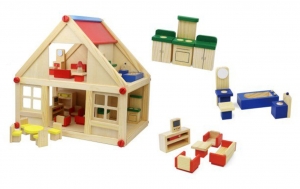 Drewniany domek to wspaniały prezent, który ucieszy Wasze dziecko.W całości wykonany jest z drewna, bardzo starannie z wszelkimi szczegółami i detalami.Jest ekologiczny.Domek podzielony jest na 2 poziomy, na każdym z poziomów znajdują się pomieszczenia.Na parterze mamy 3 pomieszczenia, na piętrze kolejne 2.Do domku dołączono niezbędne mebelki do wyposażenia każdego z pomieszczeń.Dzięki nim można stworzyć poszczególne pomieszczenia:Sypialnię, w skład której wchodzą:- duża szafa z otwieranymi drzwiami,- łóżko,- toaletka z lustrem,- lampka nocna,- stolik.Kuchnię, w skład której wchodzą trzy mebelki:- 2 małe szafki,- 1 dużą szafkę.Pokój dzienny, w skład którego wchodzą:- duża sofa,- 2 fotele,- mały stolik,- telewizor,- niska komoda.Jadalnię, w skład której wchodzą:- 4 krzesełka- 1 stół,- 1 komodę z wysuwaną szufladą.Łazienkę, w skład której wchodzą:- wanna,- sedes,- taboret,- szafką stojąca z lusterkiem.Zabawka ćwiczy zdolności manualne, koordynację wzrokowo-ruchową, uczy kreatywnego działania i logicznego myślenia.Idealnie nadaje się na prezent dla dziewczynki.Zabawka do samodzielnego montażu.