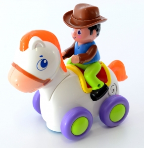 Po naciśnięciu kapelusza zabawka zaczyna wydawać dźwięki (strzelania z bicza, rżenie oraz odgłos kopyt) następnie zaczyna jeździć.